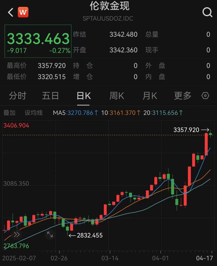 昨晚黄金价格再度飙升。北京时间4月17日凌晨,现货黄金(伦敦金现)暴力拉升逾100美元,盘中一举突破3350美元/盎司关口,最高触及3357.92美元,创下历史新高。截至发稿,金价已回落至3333.463美元。